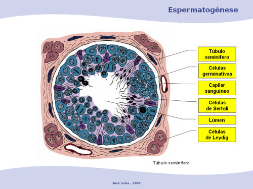 Os testículos são constituídos por lóbulos testiculares e em cada um destes existem túbulos semíferos . É nas paredes destes túbulos que ocorre a espermatogênese pois são formadas por células da linha germinativa (espermatogónias, espermatócito I, espermatócitos II, espermatídios e espermatozóides) em diferentes fases da espermatogênese e células de sertoli que rodeiam as células da linha germinativa para que estas estejam protegidas e coesas. No tecido entre os túbulos seminíferos existem células de Leydig que produzem testosterona e são responsáveis pelos caracteres sexuais secundários e pela espermatogênese.